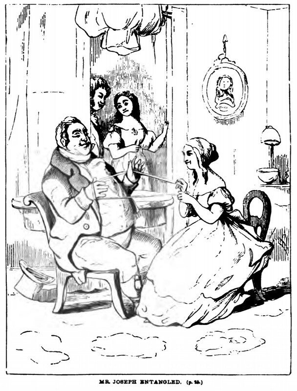 Joseph Sedley and Rebecca Sharp sit at two chairs in front of a round table; she holds both ends of a string of silk which is wound around his hands. Beneath the table is Joseph’s hat, and in the background, another table with a lamp and bowl and a portrait upon the wall. Amelia Sedley and George Osborne are entering through the doorway behind the round table at which the others sit. Below the illustration is printed its title and location in the story, “MR. JOSEPH ENTANGLED. (p. 25.)”.