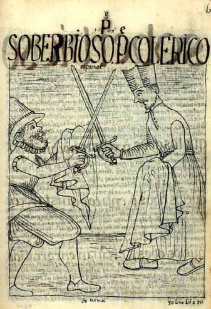 This image is illustrated in a chapter that discusses the Christian priests in the colonial government in Peru. This image depicts a Spanish priest on the right side of the illustration and a poor Spanish soldier on the left as they draw swords against one another. Both the soldier and priest are also depicted holding a blanket in their hands help with the impact of the sword fight. The author criticizes the priest for his sinful actions in engaging in a sword fight.