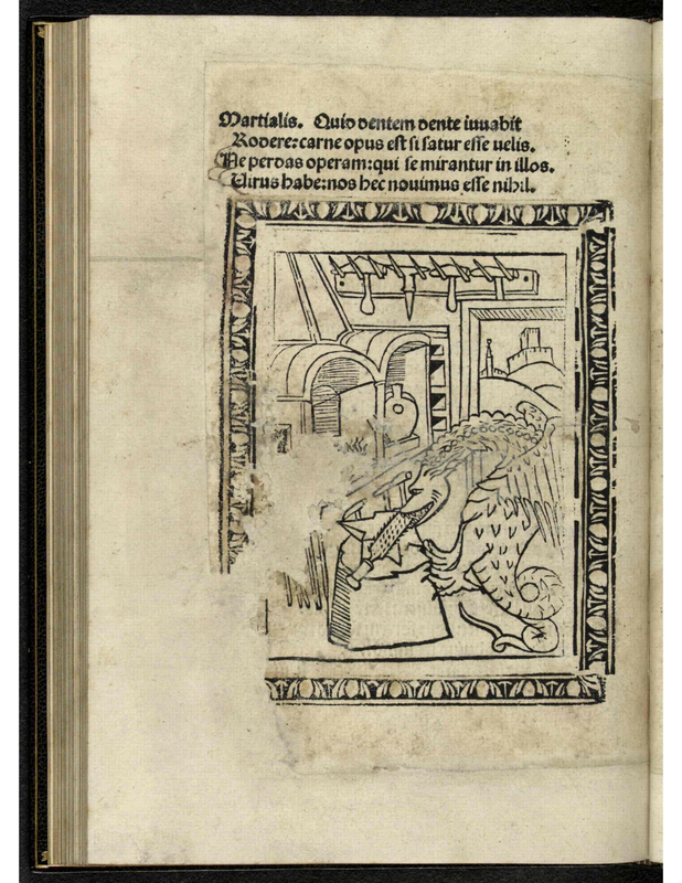 A dragon is standing on its curled tail inside a kitchen. It is holding a long tool prickly with a handle in its mouth, and it is putting it inside a bag. In front of the dragon are ovens and stoves. In the right-hand corner, the door is open and is giving the view of the rest of the village, possibly a castle.