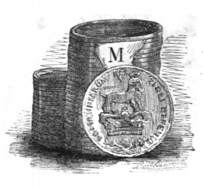 In chapter six, Gulliver explains several aspects of society in England. Here we see a stack of coins with the lion of Great Britain. Gulliver explains finances and the English fiscal system and Treasury to his Master on the Country of the Houyhnhnms. The same image appears in the 1843 Krabbe edition.