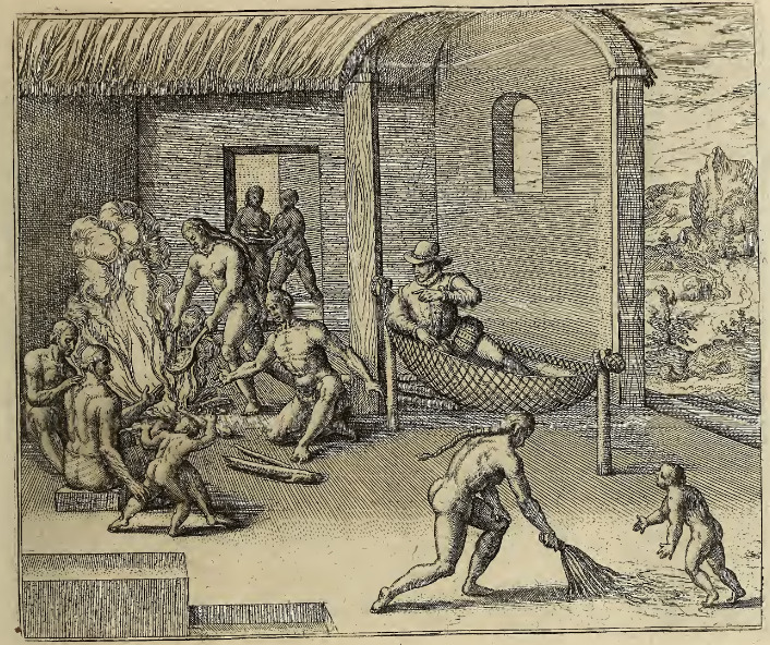 A Spanish man (Girolamo Benzoni) lounges in a hammock inside an Indigenous structure, in conversation with a Nicaraguan Indigenous leader (a Cacique). In the foreground an Indigenous woman sweeps the floor while a child frolics around her. Beside Benzoni’s hammock, a group of Indigenous men and women tend a fire and prepare food. The Cacique sits on a block close to the fire and holds onto the leg of a child while he converses with Benzoni. In the background, two women enter the room with a platter of food.
