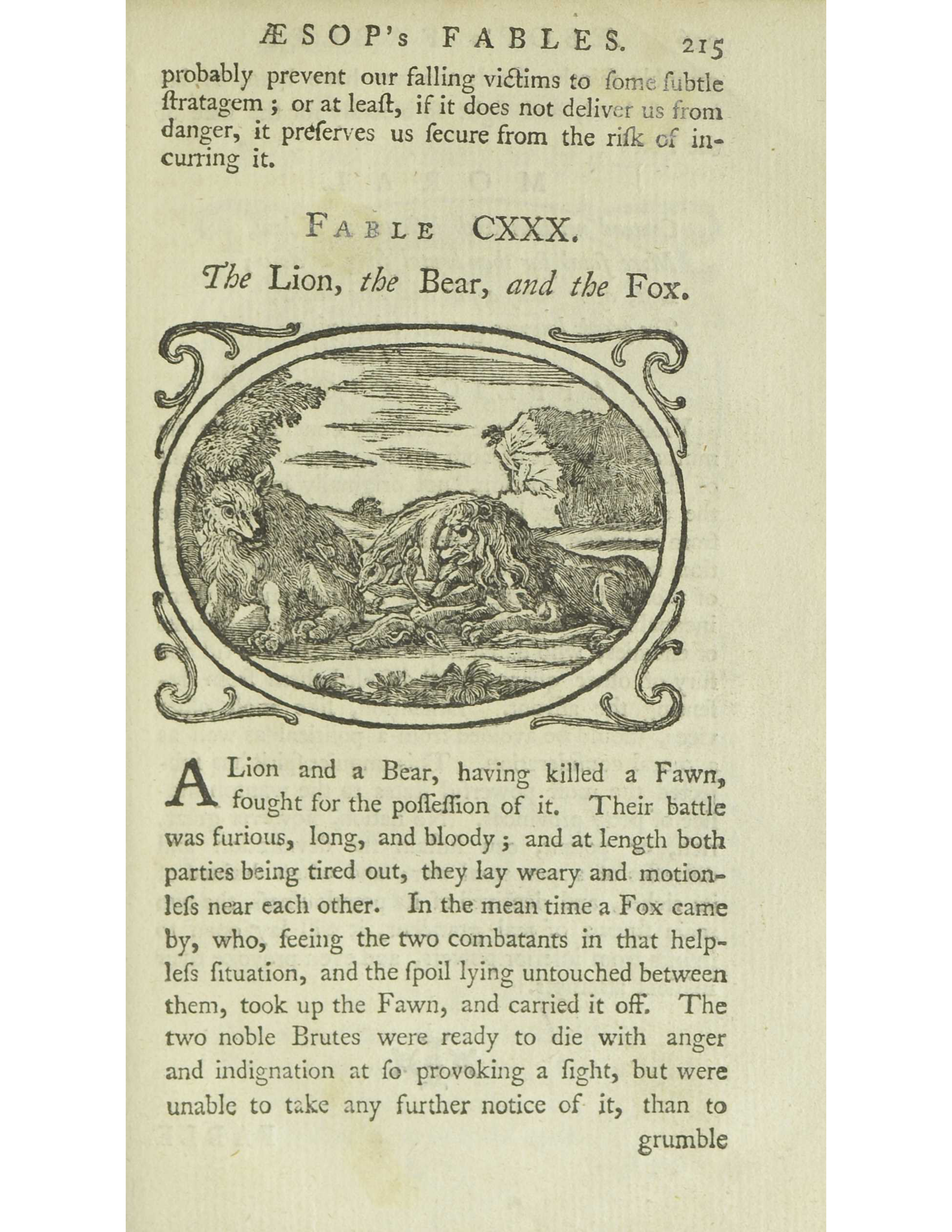 The scene is taken place outside in a field with plants and bushes around, a Lion and a Bear had just killed a Fawn and had fought for the possession of it. The battle was long and furious and they now lay tired and motionless near eachother while the Fawn still lays in between them. In the meantime a Fox comes by and sees the two combatants in their helpless situation and takes advantage of their tiredness and takes the Fawn for himself.