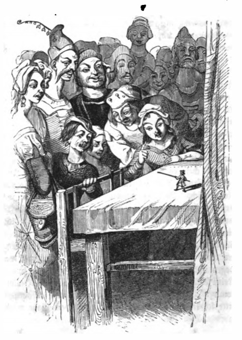 Here we see Gulliver performing for a crowd of Giants. The Farmer sold tickets to other giants to see Gulliver. On the front right, we see Glumdalclitch speaking to Gulliver and giving him instructions, while an older woman leans over her shoulder. Two other children stand in front of the table watching Gulliver. Behind the children are their parents. There are two more rows of giants in shadow. Gulliver stands on a table holding a piece of straw as though it was a fencing sword. The same image appears in the 1843 Krabbe edition.