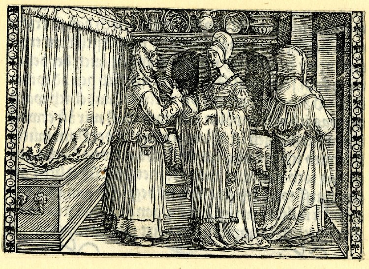 Celestina (leftmost figure) arrives at Melibea’s house, where she is greeted by Lucrecia, Melibea’s servant. As an old friend of Melibea’s mother Alisa (possibly the rightmost figure), Celestina gains entry under the false pretense of paying her a visit and selling yarn. The servant of Alisa’s dying sister arrives and informs Alisa that her sister has requested her presence. Alisa departs, leaving Celestina alone with Melibea (central figure) and Lucrecia (possibly the rightmost figure). She talks for a while with Melibea and eventually reveals that she is there on behalf of Calisto, which sends Melibea into a fit of rage. Celestina manages to quell her rage with a lie, telling her that Calisto’s cure requires only her girdle and a handwritten charm/spell (in this illustration, Melibea can be seen handing the girdle to Celestina). Melibea gives Celestina her girdle, and she asks Celestina to return the following morning to retrieve the spell.