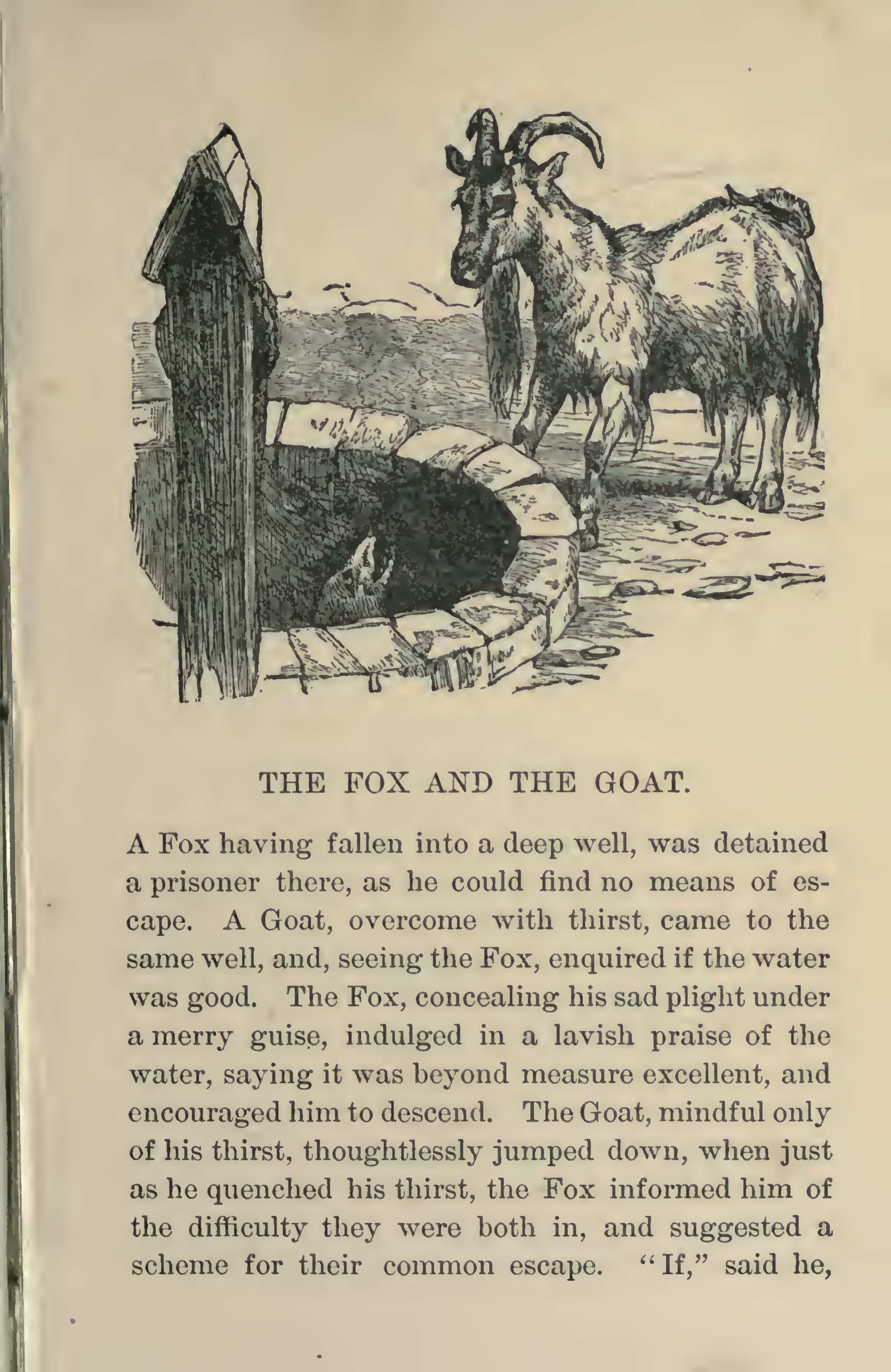 - A goat stands near a well on the right-hand side of the image. The goat has long, curly horns, and with a long beard reaching its knees. Down in the well, the head of a fox is sticking out, its mouth open while it looks up at the goat with a pleading expression.