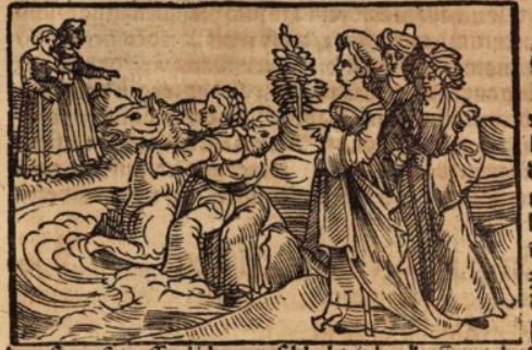 This engraving depicts Cloelia, a young Roman woman, riding a horse through a deep river with many women looking at her. Boccaccio explains that Cloelia was given to a foreign king as a hostage, and when she escaped, she took many other hostages with her back to Rome. While escaping, she came across a river that was too treacherous to pass. She found a horse, and despite never having ridden one, she got herself and the other women across safely by means of this horse. This image depicts her taking the other women across the river one by one as there is only one other female on the horse with Cloelia. There are women on each side of the shore.