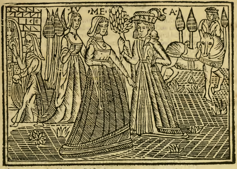 From left to right, this illustration depicts: Celestina knocking on the door to Melibea’s house with either a spool of yarn of Melibea’s girdle in her left hand, Lucrecia observing Melibea and Calisto as they meet for the first time, and an unknown male figure riding a horse. The figures of Celestina, Lucrecia, Melibea and Calisto are labelled.