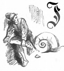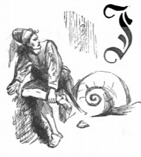[Gulliver sits next to a snail shell Brobdingnag]