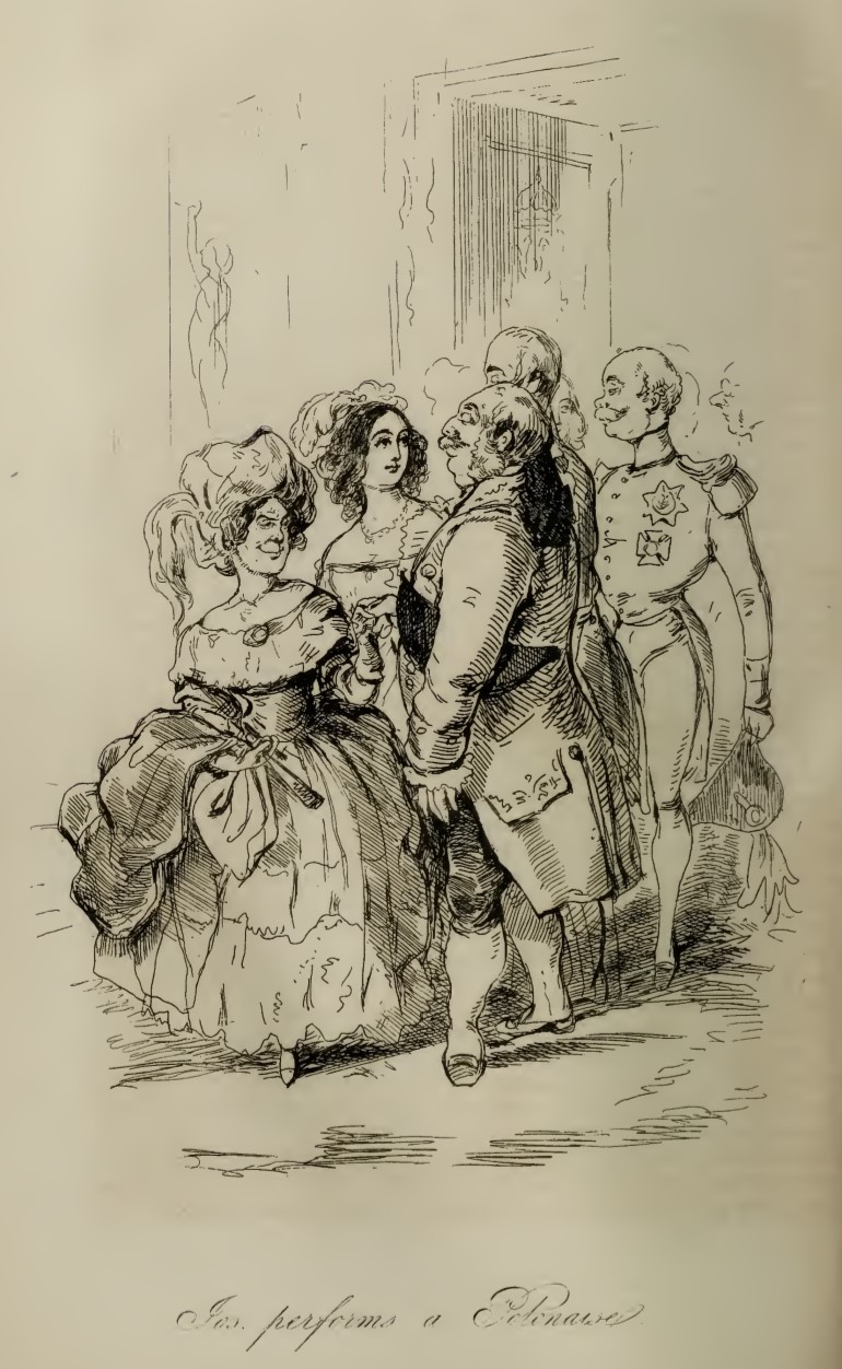Joseph Sedley stands opposite the Countess of Schlüsselback, holding her hand as they walk a Polonaise at a Court-ball. Behind them in the row are Major Dobbin and Amelia Osborne, with another decorated officer in the pair after. Below the illustration is printed in cursive its title, “Jos performs a Polonaise”.