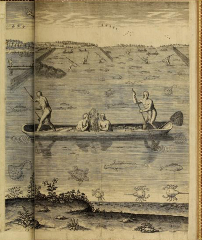 Four Indigenous people are shown in a canoe on the river. The person in the right end of the canoe fishes with a net on the end of a long stick, while the person in the left of the canoe appears to paddle. There are two individuals in the middle of the canoe sitting on either side of a fire. In the background several other Indigenous people fish in the shallows of the river on foot and in canoes using spears.