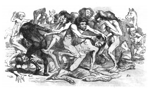 Here we see a group of Yahoos fighting each other. Gulliver’s master explains the relationships among the yahoos in the Country of the Houyhnhnms. Gulliver’s master says that the yahoos fight more than any other species, seen here. The same image appears in the 1843 Krabbe edition.