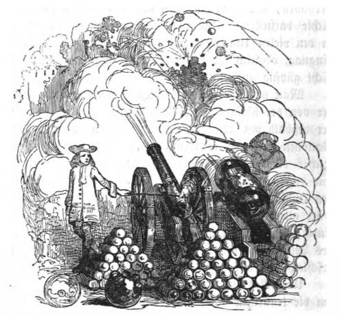 In this image we see two stacks of cannonballs with two cannons. This image appears when Gulliver describes gunpowder to the king of Brobdingnag, offering to teach the king’s military to use it. The king is appalled at the thought of such a violent invention. The same image appears in the 1839 Krabbe edition.