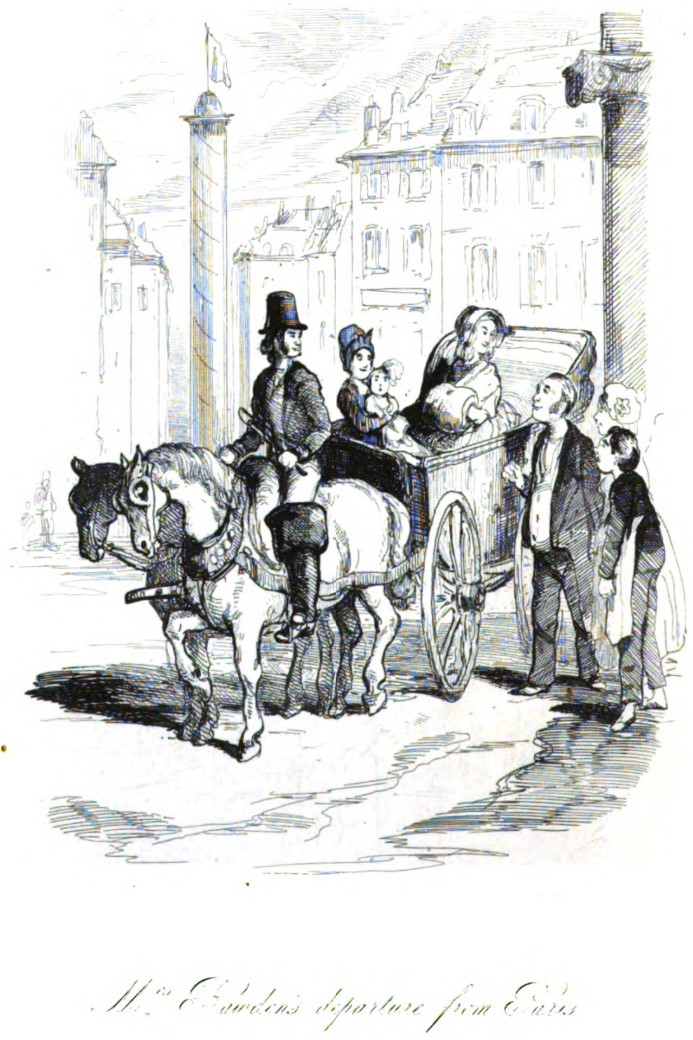 Rebecca Crawley sits grandly in a carriage, wearing a bonnet and muff and saying her farewells to the woman and two men standing beside the carriage. Opposite her sits Genevieve, the maid, holding little Rawdon. The carriage is pulled by a pair of horses, with the driver seated astride the larger of the two. In the background, the buildings of Paris and a tall tower topped with a flag can be seen. Below the illustration is printed in cursive its title, “Mrs. Rawdon’s departure from Paris.”