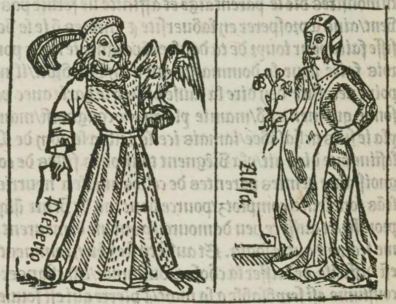 The left panel depicts Melibea’s father Pleberio, who is wearing regal attire and a large chain. This panel was first used to represent Calisto, which explains the falcon perched on his left arm. It is odd that the printer would use this panel to represent someone other than Calisto. In the right panel we see Melibea’s mother Alisa, who is wearing a veil and a robe. In her right hand she is holding flowers.The entire image is nearly identical to the one found on page 170 (where the left panel is labeled ‘Calisto’ and the right panel is labeled ‘Lucresse’). The left panel is nearly identical to those found on pages 88 (where it is labeled ‘Calisto’), 135 (where a decorative panel is added and it is labeled ‘Sepronio’ [which appears to a typo]), and 244 (where a decorative panel is added). The right panel is nearly identical to the one found on page 61 (where it is labeled ‘Lucrecia’).
