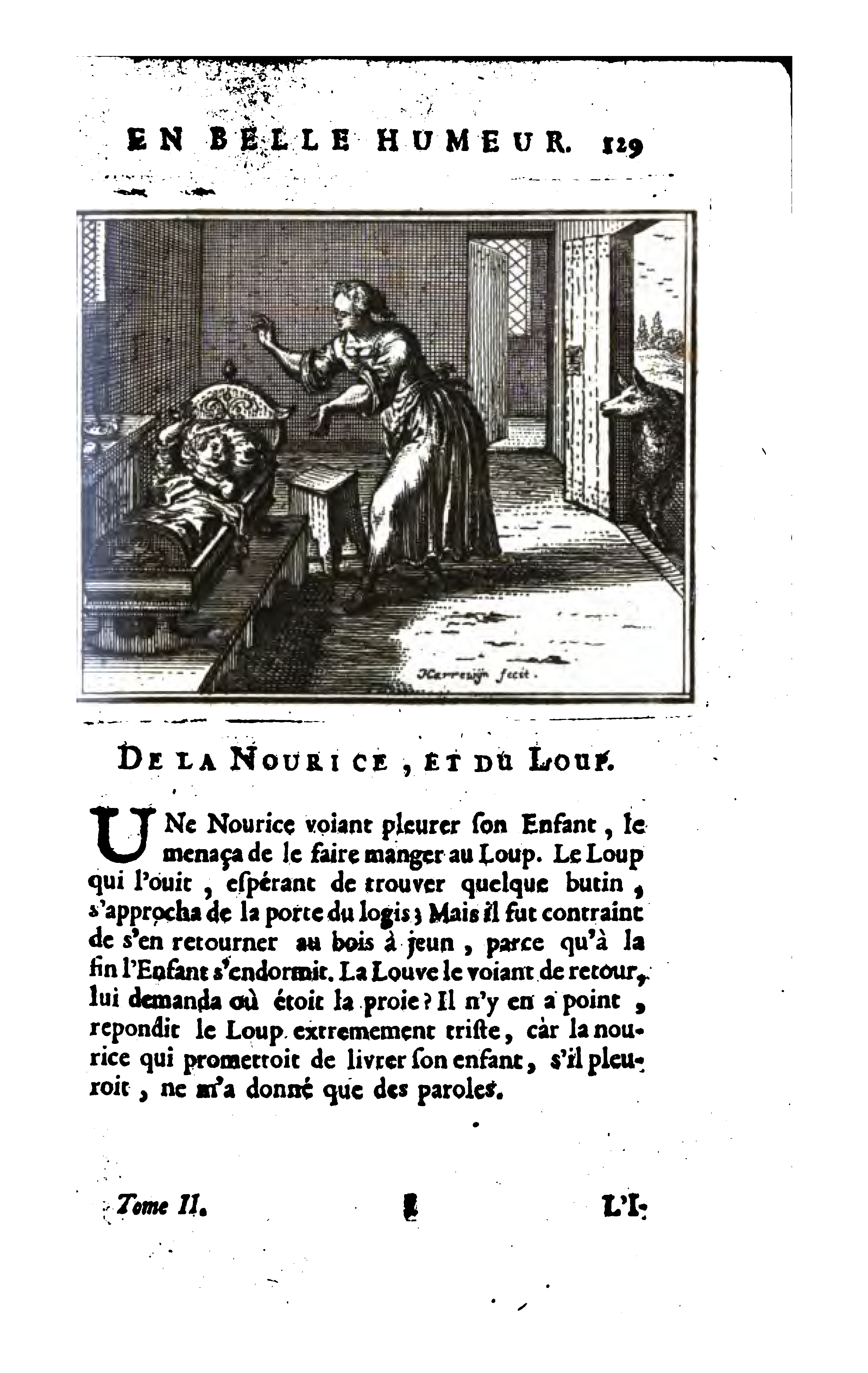A nurse tells a child to be quiet or she will throw you to the wolf. A wolf passing close under the window heard this, and thought himself very lucky as the child was sure to cry again, and waited by the window. He waited till at last the child began to cry, and the wolf came forward before the window, and looked up at the nurse. But, all the nurse did was shut the window and call for help, and, the dogs of the house came rushing out. The wolf ran away.