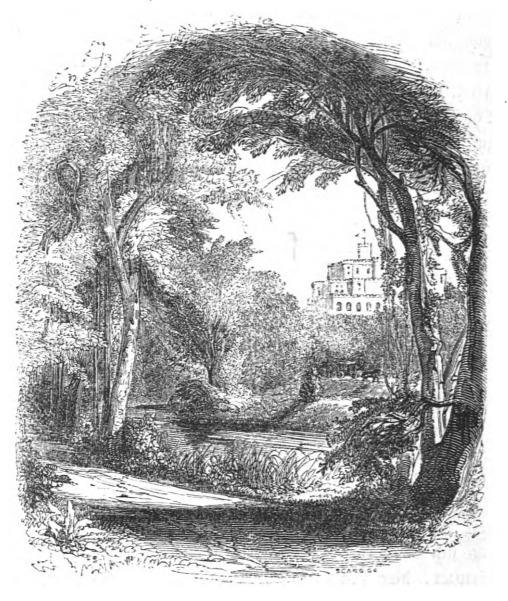 Leaving the city of Lagado, Gulliver and his guide arrive at a large estate in the countryside, which functioned as the academy for scholars. In contrast with the city which seemed to be crumbling, the house in the country was large, built in the style of ancient architecture. Gulliver describes the landscape with fountains, walks, groves, gardens, and avenues, all well-kept. This image shows the view from one of the walks, through the trees looking towards the academy. The same image appears in the 1839 Krabbe edition.
