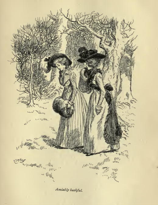 In this image Elinor and Lucy Steele walk from Barton Park to Barton Cottage. On this walk, Lucy revealed to Elinor that she was engaged to Edward Ferrars, and had been for a year. Elinor was shocked, not knowing how to respond. This scene occurs in chapter 22. The characters are shown in the traditional regency style, as Elinor and Lucy wear the regency style dress with an empire waist. They wear bonnets and muffs. The regency period dated to the early nineteenth century (1811-1820) when George, Prince of Wales, later George IV (r. 1820-1830), reigned as regent for his mentally ill father, King George III (r. 1760-1820). The regency period is associated with the rise of neoclassicism in art and fashion.