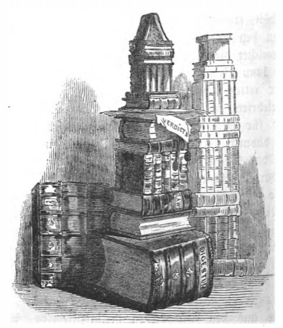 In chapter five, Gulliver explains several aspects of society in England. Here we see a stack of books that have records of past court cases. The image appears when Gulliver explains the rule of precedent to his Master. The rule of precedent is when a judge or lawyers refer to the outcome of a past court case to determine what should be done in a similar situation. The same image appears in the 1839 Krabbe edition.