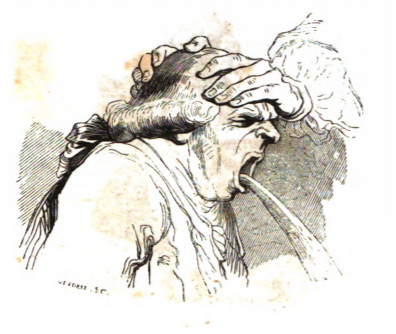 Gulliver explains the various medicines used in England to treat disease. In this image we see a man vomiting after taking medicines. Gulliver explains that the man vomits because of the foul taste of the medicine which included ingredients such as reptile skins, bones, excrements, insects, herbs, minerals, gums, oils, and juices. The same image appears in the 1843 Krabbe edition.