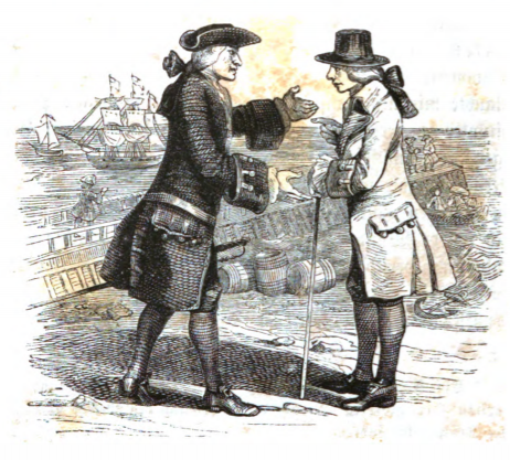 In this image, Gulliver speaks with Captain William Prichard, who convinced Gulliver to travel with him to the South Sea on the ship called the Antelope, which is visible in the background. The two men discuss their voyage on the land, with several barrels behind them. Other members of the crew can be seen in walking and talking on the dock, behind Gulliver and Prichard, with two other men in a small boat, loading cargo from the dock to take to the ship. An anchor is in the water behind the men. A small sailing boat is next to the larger ship. The men can be identified by their clothing, with Prichard wearing a captain’s tricorne hat and fine coat, while Gulliver wears a flat brimmed top hat and carries a cane. The same image appears in the 1843 Krabbe edition.