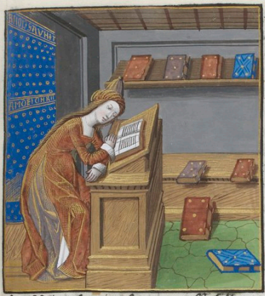 This illustration depicts a woman named Proba leaning over a podium as she reads a book. Proba is renowned for her intellect and intensive knowledge of literature, including works from Virgil. Proba had taken lines from the "Aeneid", "Bucolics", and the "Georgics" and transformed them into a cento focusing on the Old and New Testaments. There are many books depicted in this image, which are most likely representative of the works of Virgil, Homer and other famous authors of which she composed her cento from.
