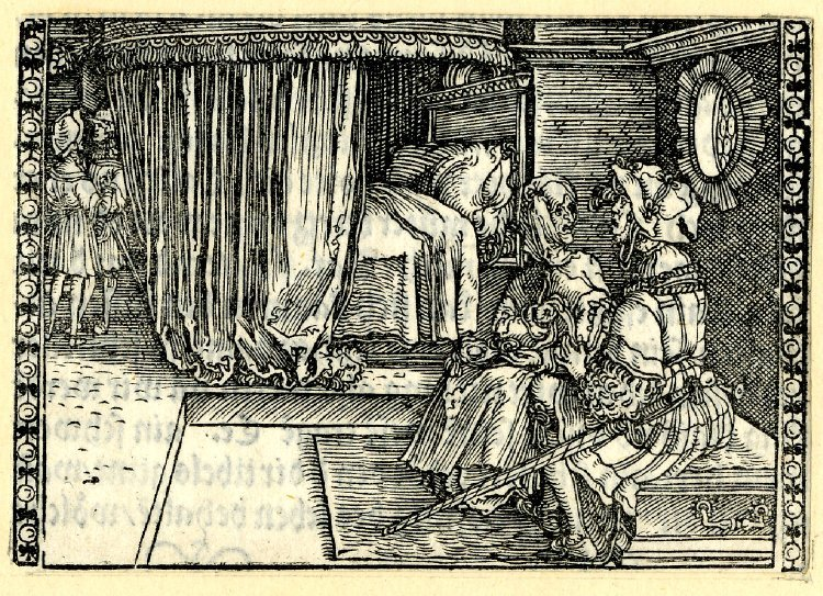 When Celestina (second figure from the right) and Sempronio (one of the figures to the left) arrive at Calisto’s house, Celestina tells Calisto (rightmost figure) about her meeting with Melibea. Calisto experiences impassioned mood swings with every sentence that Celestina speaks, and Pármeno (one of the figures to the left) starts chiding both him and Celestina. Sempronio grows impatient with Pármeno and tells him that his words are harming the happiness of all. Celestina eventually shows Calisto the girdle (presumably the scene depicted here), and he is overjoyed. When the time comes for Celestina to depart, Calisto asks Pármeno to accompany her and ensure that she arrives home safely.