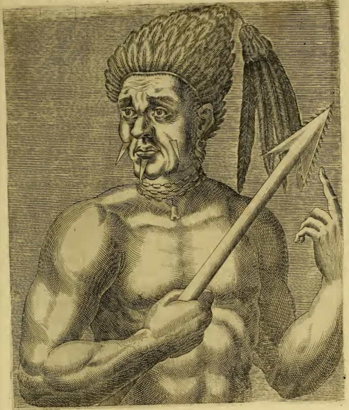 Nacolabsou (Nacol-Absou) is shown in portrait from the waist up, with his torso angled slightly to his left and his gaze directed into the distance to his right. He wears a large headdress constructed mostly of layered feathers, with a tassel of several long feathers hanging from the peak of the headdress. He has three pointed face stones, one in each cheek and one in his chin. Nacol-Absou wears earrings and a beaded multi-strand necklace, but no clothing on his torso. He holds a spear in his right hand and points at the sharp tip of it with his left. Not much is known about Nacol-Absou or the Promontory of Cannibals (although it is suggested to be near the present-day Guianas in South America). Thevet describes him in derogatory terms as savage, beastly, and cruel. Thevet’s biography suggests that Nacol-Absou died in the attempt to capture a Spanish fort near a river.