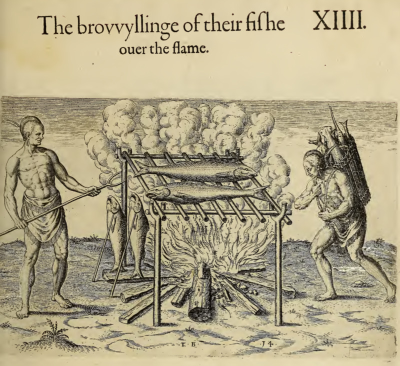 Two Indigenous men are shown cooking fish over a fire. Two fish are laid out on a rack over the flames, two others are propped up with sticks tail-down on the ground by the fire. The rack is composed of four forked sticks propped vertically on the ground, with four others forming a square horizontal to the ground, and five more laid across the the square forming a rack. One of the men holds a forked stick, the other carries a basket of fish slung across his back. Both men wear fringed garments tied around their waists and have a single feather in their hair.