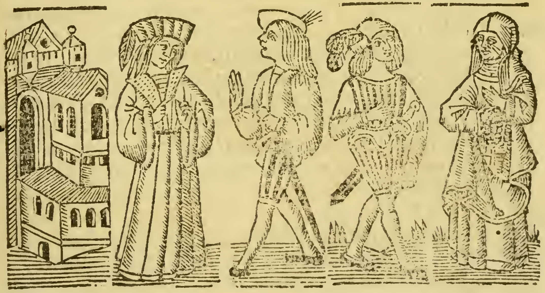 After visiting Melibea, Celestina returns home to find Sempronio waiting. She tells him she has good news, though she refuses to tell him anything more until they are with Calisto. Thus, they depart for Calisto’s house. Pármeno spots them as they approach, and Calisto tells him to let them in.The three male figures are all depicted wearing hats, while Pármeno and Sempronio (two central figures) have swords mounted on their belts. Celestina is depicted wearing a robe and veil, with a rosary in her right hand.[The central left figure is the only figure in this illustration that does not appear elsewhere in the edition. The three remaining figures appear in multiple other illustrations.]