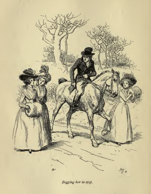 In this image Edward Ferrars is on horseback, meeting Elinor, Marianne, and Margaret out for a walk. When they saw Edward in the distance, Marianne was convinced it was Willoughby and sped up. When she realized that it was not Willoughby, she began to turn back to go home, but her sisters and then Mr. Ferrars joined together in begging her to stop and continue on with them. This scene occurs in chapter 16. The characters are shown in the traditional regency style, as Marianne, Elinor, and Margaret wear the regency style dress with an empire waist. Elinor, Mrs. Dashwood, and Margaret wear bonnets, and carry muffs. Edward Ferrars a waistcoat and tailcoat with breeches and a top hat. The regency period dated to the early nineteenth century (1811-1820) when George, Prince of Wales, later George IV (r. 1820-1830), reigned as regent for his mentally ill father, King George III (r. 1760-1820). The regency period is associated with the rise of neoclassicism in art and fashion.