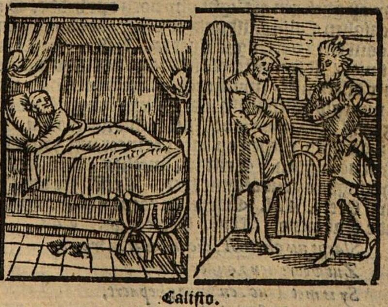 While Calisto lies in bed (to the left of the image), his servant Tristan spies Sosia, another of his servants, walking toward the house in tears (to the right of the image). Demanding the cause of his sorrow, Sosia explains that Sempronio and Pármeno have been executed in the street by the justice’s (the alguacil’s) men.To the left, we can see Calisto sleeping. His bed appears luxurious, with drapery hanging from above. A chair is situated in the foreground. To the right we see Tristan and Sosia. Sosia is presumably the rightmost figure, since he is just arriving at the house in this illustration. His appearance is slightly odd, since there are no lines allowing us to distinguish his hair and beard from his face. His hands are held in a clasped position, but I am uncertain of what this is intended to signify. Further, he has a sword mounted on his belt. Tristan is shown with his hand over his chest and a hung head, saddened by the news that Sempronio and Pármeno have died. He is wearing a hat as well.