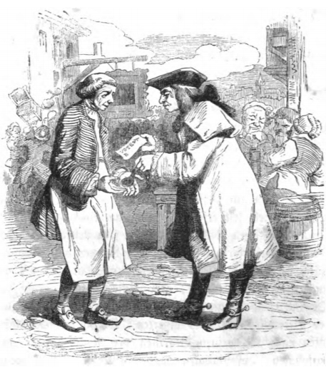 Here we see a politician bribing a voter. The politician is on the right and hands the man on the left a piece of paper that reads “vote … B”, and a small bag of money. In this chapter Gulliver talks with the King of Brobdingnag about English traditions. Gulliver tells the King about diplomacy, religion, the justice system, the arts, the financial system, and the nobility, then debated these issues with the king. This image comes when Gulliver is discussing the corrupt political atmosphere and the election of officials. The same image appears in the 1843 Krabbe edition.