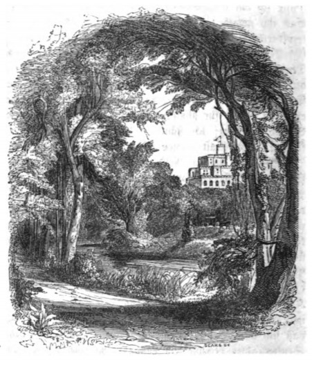 Leaving the city of Lagado, Gulliver and his guide arrive at a large estate in the countryside, which functioned as the academy for scholars. In contrast with the city which seemed to be crumbling, the house in the country was large, built in the style of ancient architecture. Gulliver describes the landscape with fountains, walks, groves, gardens, and avenues, all well-kept. This image shows the view from one of the walks, through the trees looking towards the academy. The same image appears in the 1843 Krabbe edition.