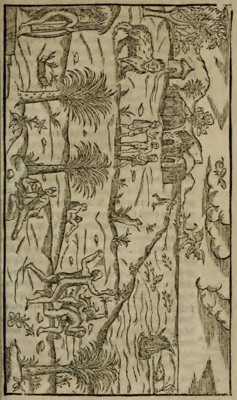 An Indigenous village is shown, full of fantastical creatures. In the center of the scene an Indigenous person speaks with two European men. A large hairy creature stands to the left of the three. In the foreground on the left an individual holding a bow emerges from a building. In the center another person lays on the ground with a horned, humanoid creature leaning over them. To the right two more individuals run from another of the horned creatures. There is a ship and a large creature in the water near the coast on the right, and further up the coast a person chases after a large winged creature. There are several structures in the background.