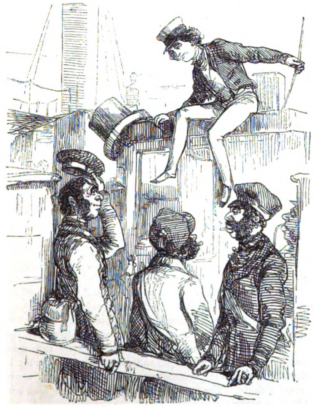Georgy Osborne sits on top of his family’s carriage after climbing across the others, holding onto a rope with one hand. On the deck next to the railing below him are three workers; the one furthest to the left is Mr. Kirsch, the courier, who is lifting his hat in greeting to Georgy.