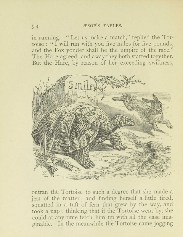 - On a dirt path a tortoise stands in front of a mile marker reading “3 miles”. Next to it, a smaller hare is seen running towards the tortoise, looking at it unpleased.