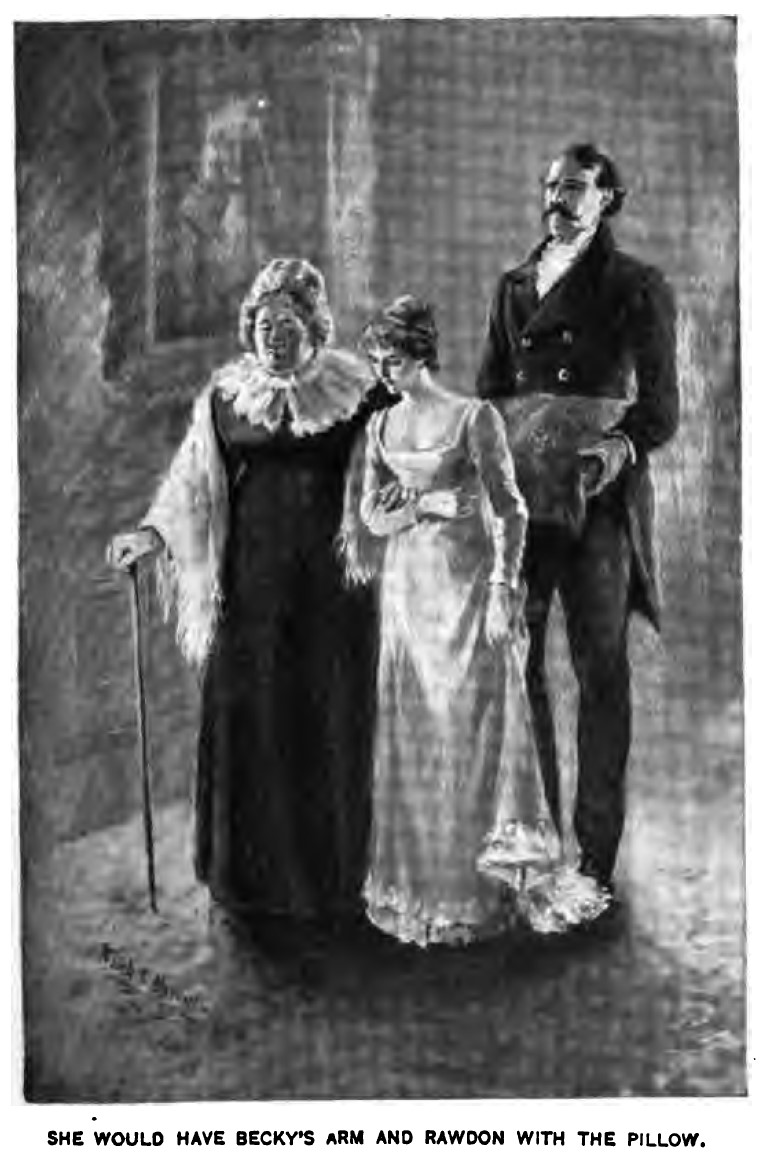 The image depicts a scene from page 95, in which Miss Matilda Crawley directs Rebecca Sharp and Rawdon Crawley to walk her in to dinner. Miss Crawley is shown in a black dress with a white collar and shawl, holding onto Rebecca Sharp’s arm with one hand and using a cane with the other. Behind them stands Rawdon Crawley in a black suit with two rows of buttons, holding in both hands a cushion for Miss Crawley to sit on. A portrait hangs in the background.