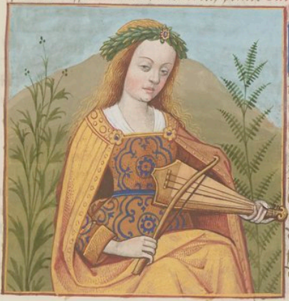 This illuminated image depicts a woman named Medusa in her human form. Prior to being transformed into a monster by the goddess Minerva, Medusa was a beautiful woman who captured every man’s heart who happened to look upon her. She is depicted wearing a wreath and playing the lyre in this image.