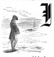 Here we see Gulliver looking out at the water before preparing to set sail on his fourth and final journey. This image appears at the beginning of Part Four, at the beginning of chapter one. The letter “I” appears in the top corner as it is the first word of the chapter.