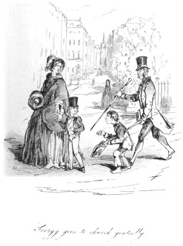 Georgy Osborne in a top hat and suit, holds onto his aunt Jane Osborne’s hand, and is turned to face the boy who has come up behind him. The boy is a young sweep, barefoot and with ragged clothes, begging for money. The footman, carrying the church books, is behind the sweep, trying to drive him away with a cane. In the background is Amelia Osborne, who was going for a walk on the cross-street to the one the others are taking to church, watching proudly as her son gives money to the sweep. Below the illustration is printed in cursive its title, “Georgy goes to church genteelly”.