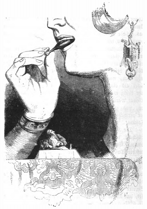 In this image we see Gulliver eating with the Queen of Brobdingnag. She eats a drumstick while Gulliver sits on the table next to her. The queen wears lizard earrings. Gulliver sits at a smaller table underneath the queen’s arm. He has his own plate of food and looks up at the queen as she eats. The same image appears in the 1839 Krabbe edition.
