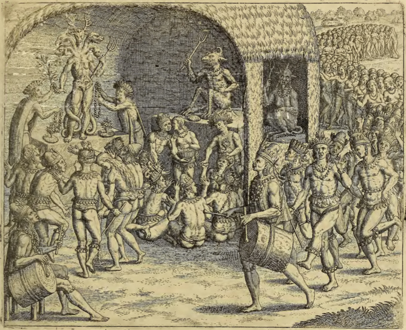 A large group of Indigenous people conduct a religious ceremony. One individual, dressed to reflect several different animals including an owl, snakes, a stag and wildcats, stands on a platform or altar inside a dwelling on the left. Two people offer strands of beads and a branch to this individual. Two other people wearing animal heads sit on altars further inside the building. Some of the Indigenous people sit on the ground inside the dwelling, some dance near the first altar, two play drums, and others arrive at the site in a long, dancing procession. Most of the individuals wear feathered headdresses, beaded jewelry, and other feathered adornments around their necks and waists.