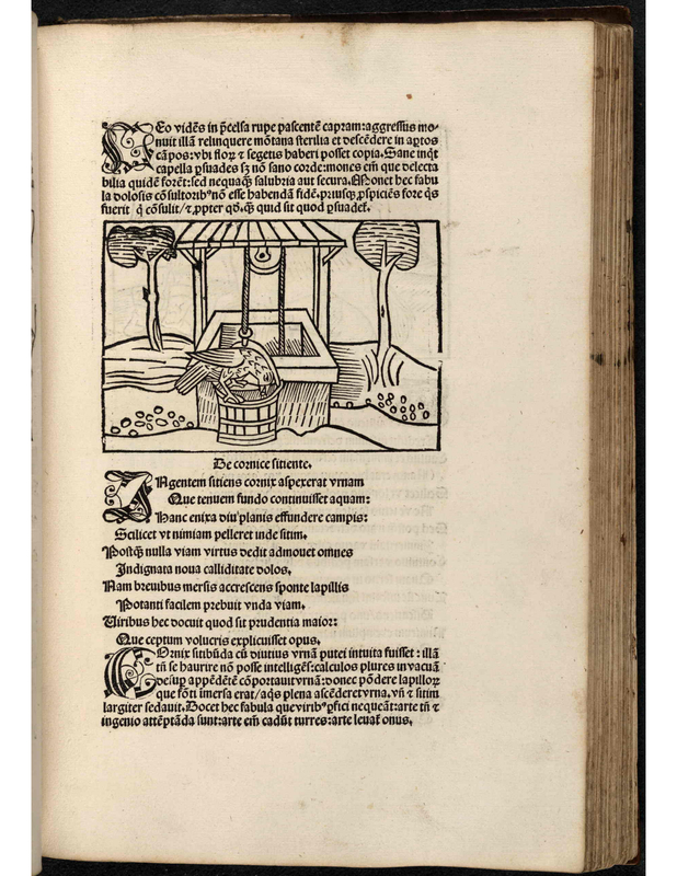 - In the centre of the image, there is a well with a bucket. On the rim of the bucket, there is a large crow about to drop a pebble in the bucket.