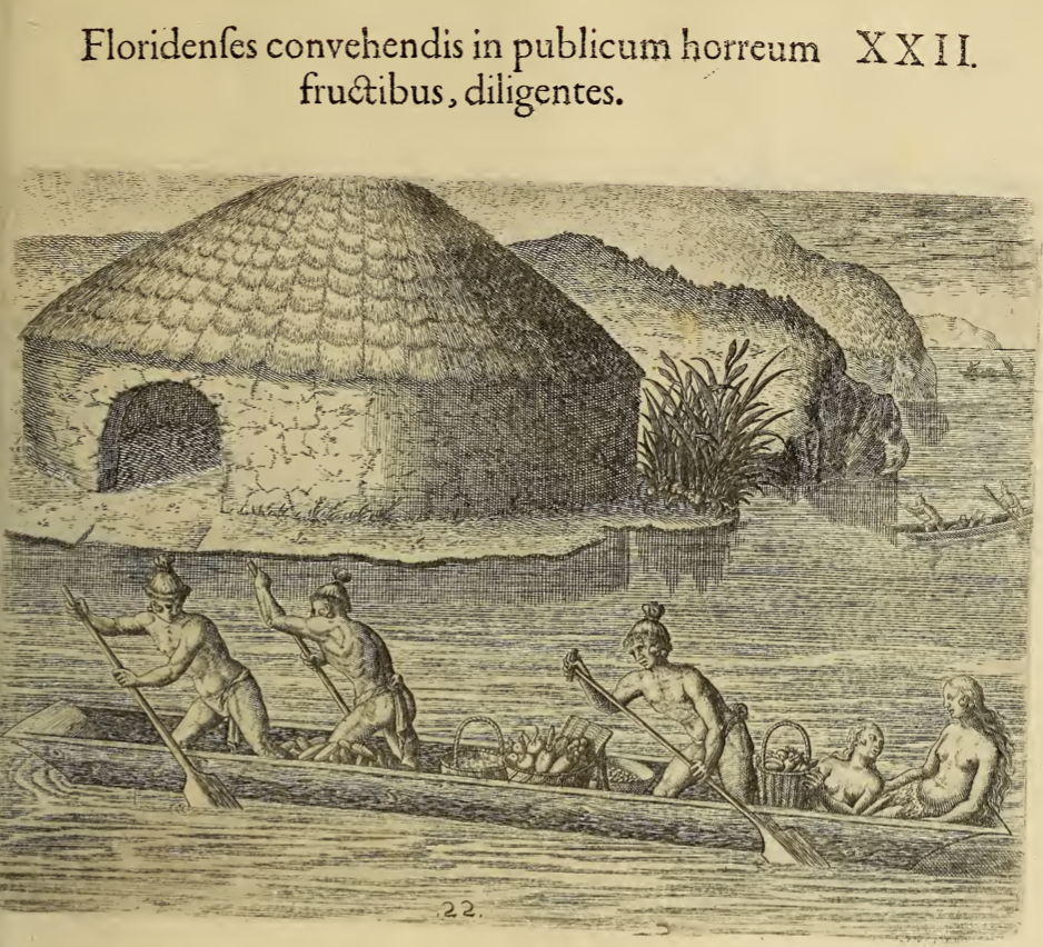 Several Indigenous people bring crops by canoe to a large storehouse. There are baskets of various types of produce in the canoe, three men stand to paddle while a woman and young person sit in the rear. The storehouse is a large round structure on the bank of the river.
