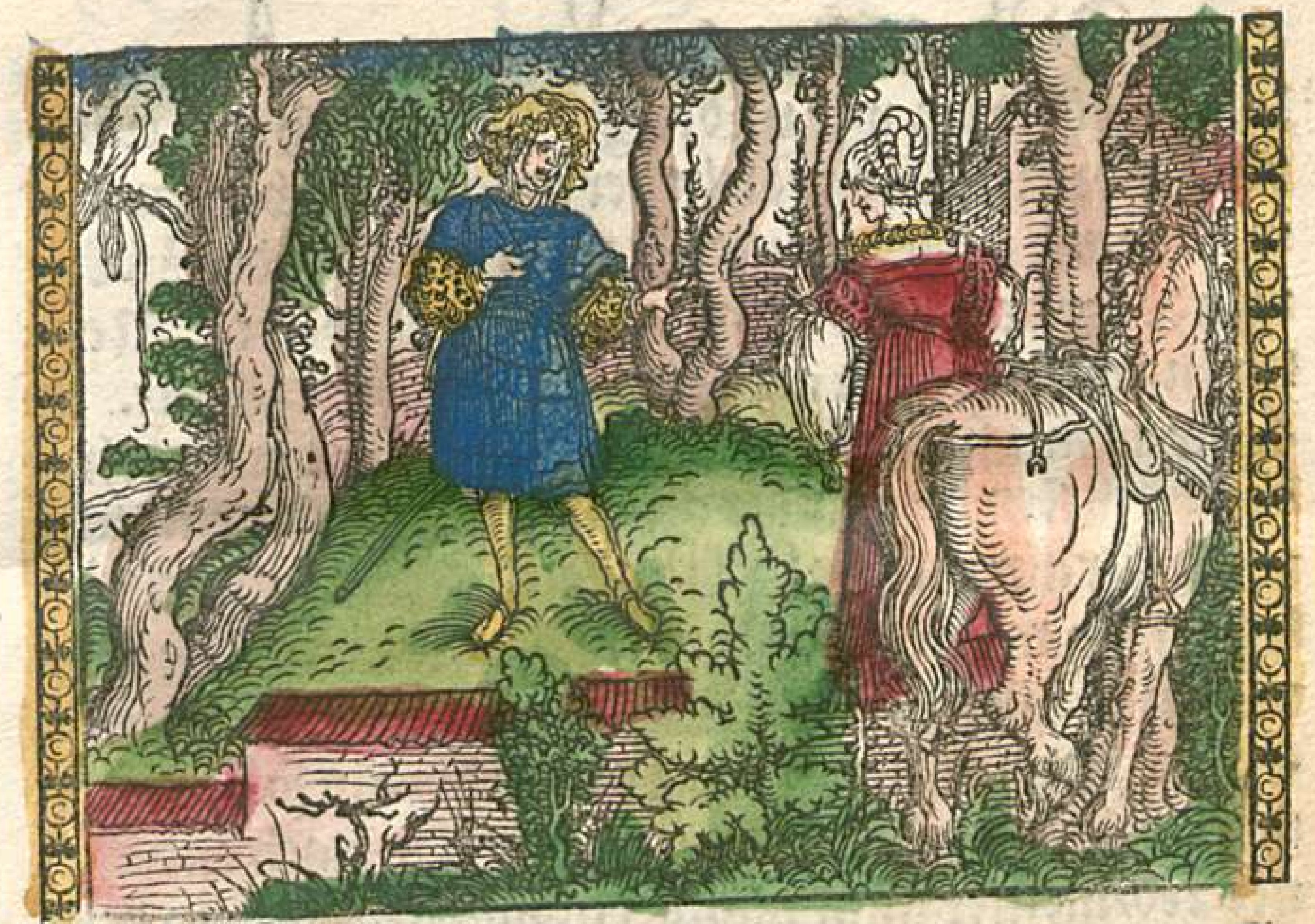 This image depicts the first encounter Calisto (figure to the left) has with Melibea (figure to the right). While practicing his falconry, Calisto follows his bird (top-left corner) into Melibea’s garden, where he first lays eyes upon her. He is struck by her beauty and instantly falls in love. In addition to these figures, there is a horse behind Melibea.