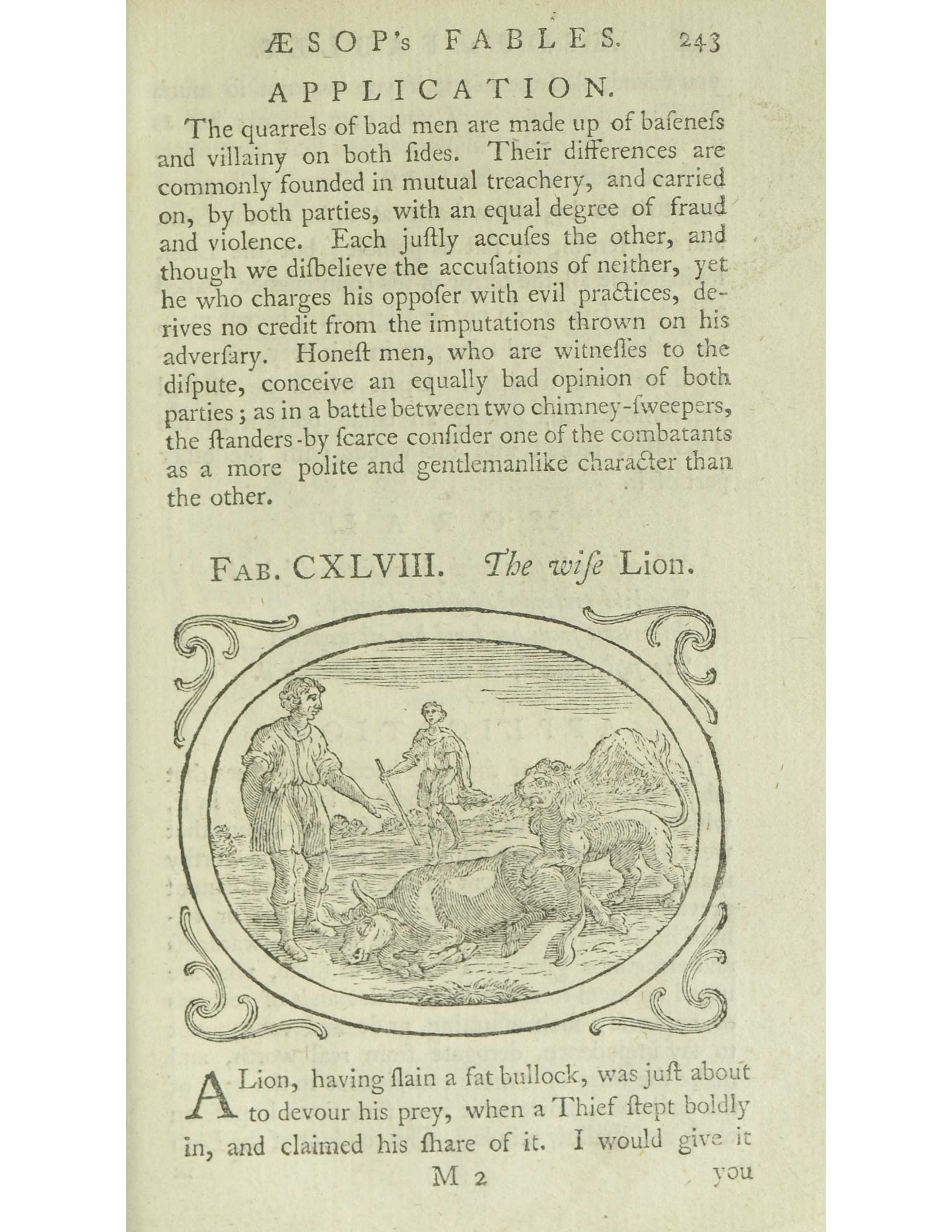 The scene is taken place outside, 2 men and a lion and deceased bull that was slain by the lion, one man is pointing at the bull and another man with a walking stick/cane is approaching behind in the distant. The scene seems to be taken outside as you can see the sky, plants and other vegetation. The man is looking to take a share of the bull from the lion, but the lion will not let him because he was being rude. The other man however received half of the bull from the lion because of his modesty.
