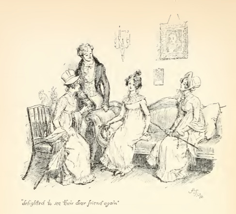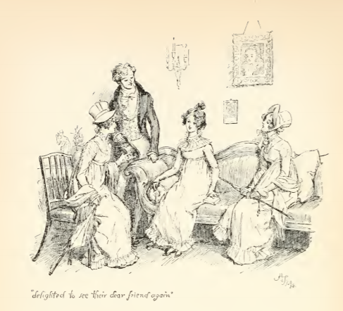 In this image Mr. Bingley, Caroline Bingley, and Mrs. Hurst come to Longbourn to invite Jane to a ball they will be hosting at Netherfield. This was the first reunion of Jane with the Bingleys after her illness that kept her at Netherfield. She was happy to see them again and gladly accepted their invitation. This scene occurs in chapter 17. The characters are shown in the traditional regency style. Jane, Caroline Bingley, and Mrs. Hurst wear regency style dresses with empire waistlines and their hair tied up. Mr. Bingley wears a waistcoat and tailcoat with a cravat. The regency period dated to the early nineteenth century (1811-1820) when George, Prince of Wales, later George IV (r. 1820-1830), reigned as regent for his mentally ill father, King George III (r. 1760-1820). The regency period is associated with the rise of neoclassicism in art and fashion.