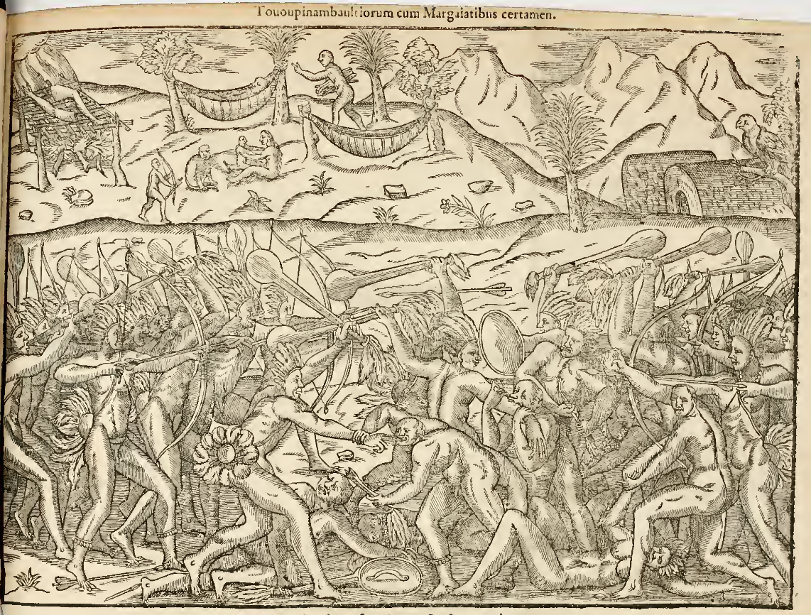 Two groups of Indigenous people are shown engaged in conflict. Individuals on both sides wield a combination of bows and arrows and clubs as weapons. A few people also carry small shields. Members of both groups wear feathered headdresses and feathered adornments slung around their shoulders and hanging at their backs. In the background behind the warring groups there is an Indigenous village with several people going about their lives. There are two long structures on the right and two hammocks strung between trees. One person lounges in a hammock, another carries firewood. A woman sits on the ground with a child while another child carrying a small bow walks nearby. A monkey also sits near the group. To the left, a rack with several human limbs on it sits over a large fire.