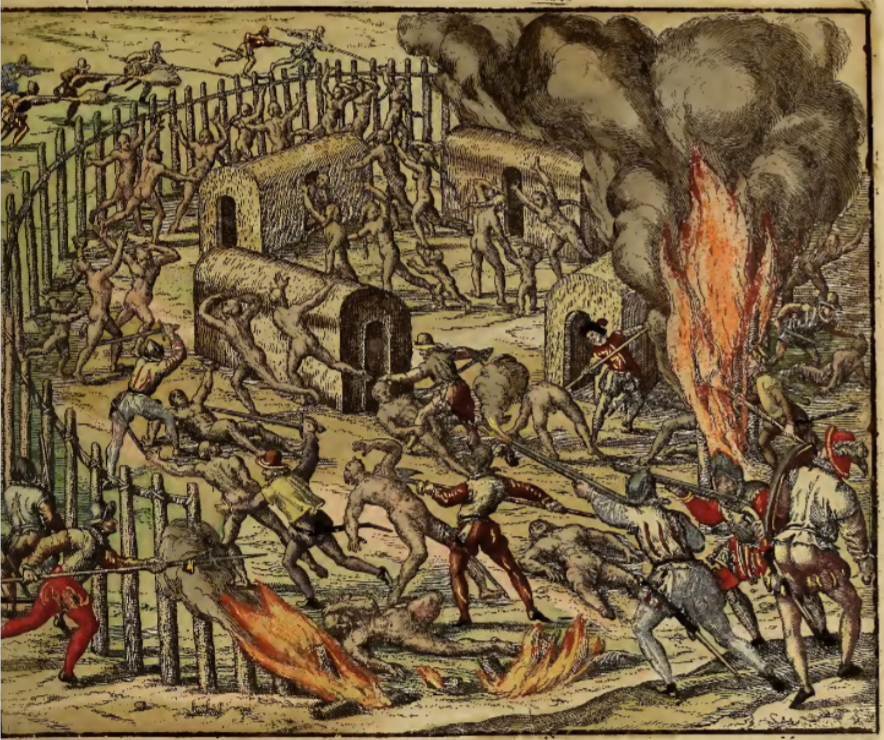 A group of Spanish soldiers attack an Indigenous village, killing the inhabitants with swords, spears, and muskets, and setting fire to the village. The Spaniards have surrounded the village and attack from all side with their assorted weapons. The Indigenous men, women and children are trapped in the village, several have already been killed and those alive have no escape. The fire, set against the fence encircling the village, is burning around the fence and has caught two of the four dwelling that make up the village. This image is identical to one found on page 183 of Frankfurt, 1594, but colored.