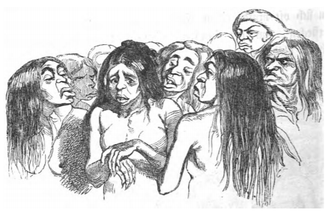 Gulliver’s master explained various aspects of the Yahoos that lived in the Country of the Houyhnhnms. He told Gulliver that when a foreign female yahoo approached, she would be surrounded by other female yahoos who would examine her and speak with her, often expressing their contempt or disdain. The same image appears in the 1839 Krabbe edition.
